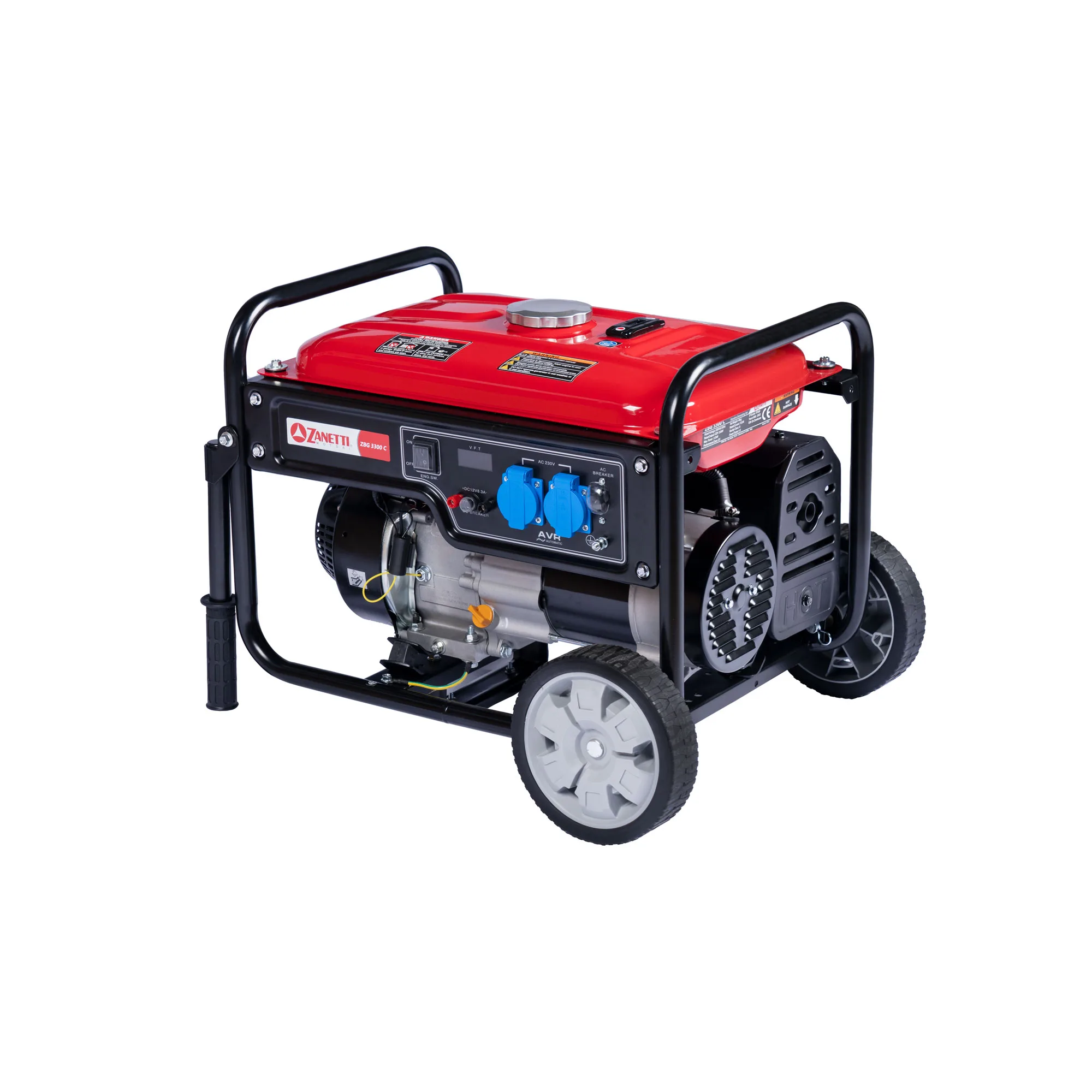I generatori benzina aperti sono disponibili con corrente in uscita monofase 220 Volt. Hanno tutti di serie il regolatore automatico di tensione AVR che permette di rendere stabile la tensione in uscita, “OIL ALERT”, il kit carrello con ruote e alternatori con avvolgimento in rame. Il modello ZBG 5500 CEA è predisposto per il collegamento a centralina di intervento ATS, consentendo l’avvio automatico del generatore nei casi di interruzione di energia elettrica della rete.